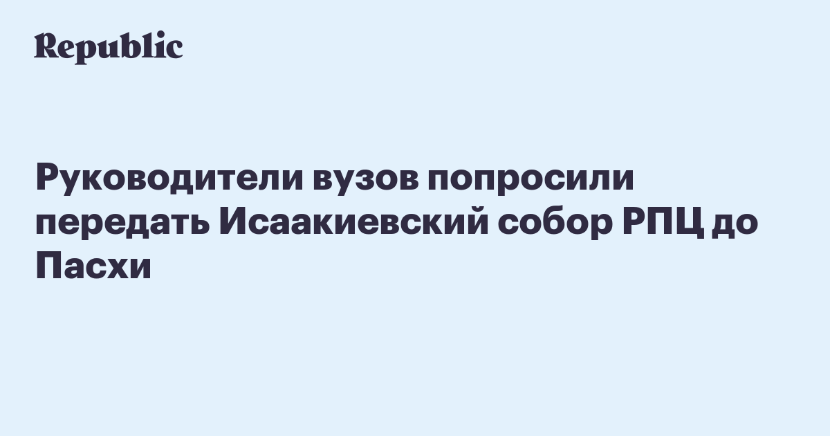 «Мы считаем, что процесс передачи должен быть завершен в ближайшее время, чтобы воспрепятствовать так называемым оппозиционерам и политиканам, а по сути, провокаторам, которые используют вопрос об Исаакиевском соборе как повод для нагнетания напряженности в обществе и сеяния религиозной розни», – приводит слова ректоров агентство.