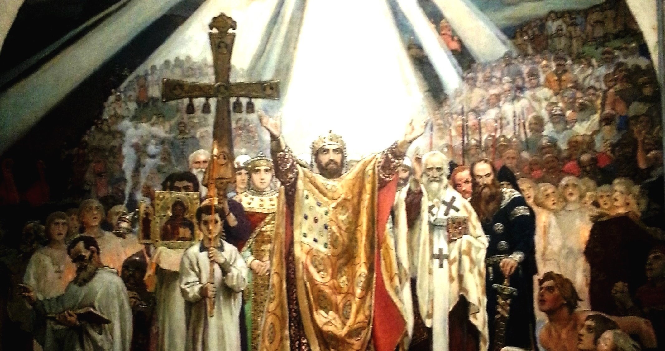 В доказательство приводят тот фрагмент "Повести временных лет", согласно которому новую веру вводили принудительно, и Владимир, побуждая киевлян креститься, прибег к угрозе: не явившиеся на реку объявлялись личными врагами князя. Поскольку христианство - книжная религия, то понадобились отроки на ученье книжное, своего рода семинаристы. Князь Владимир употребил силу: он набирал будущих причетников из семейств "нарочито чадий", как тогда именовалась социальная элита. Цитирую "Повесть временных лет": "Матери же сих чад плакали по ним, ибо еще не утвердились в вере, как по мертвым". Деяния князя Владимира сопоставляются иногда с деяниями царя Петра Первого, также вводившего насильственное европейское обучение. Пушкин, основываясь на фамильном предании, писал: "Жены молодых людей, отправленных за море, надели траур: синие платья". Синее в данном случае - синоним черного. В качестве доказательства привлекается и археологический материал, будто бы подтверждающий позднее всегда считавшееся баснословным известие Иоакимовской летописи о вооруженном сопротивлении крещению жителей Софийской стороны Новгорода. Они расправились с прихожанами Спасского храма, якобы, расправились, которые до 988 или 989 годов мирно уживались с языческим большинством. Известный наш археолог академик Янин, локализовав церковь Спаса в Новгороде на Разваже улице, произвел здесь широкие раскопки и обнаружил "следы пожара 989 года, уничтожившего всю застройку". Все это так, да не так, все это чрезвычайно сомнительно. Матери всегда оплакивают разлуку с детьми. Мы знаем, что никаких общественных потрясений отправка дворянских недорослей в Европу не вызвала. По аналогии можно допустить, что в исходе Х века все обошлось более или менее спокойно. Что до увязки позднелетописного богословия и новгородского пожарища, ее надлежит счесть излишне смелой, поскольку археологическая датировка с точностью до года невероятна, и вообще, и в данной ситуации. Невероятно так же и крещение новгородцев "мечом и огнем", как читается в Иоакимовской летописи, - у князя Владимира и его сподвижников для этого не было никаких возможностей. Ошибочно представлять себе киевского князя самодержцем вроде Петра Великого. Князь очень зависел от народного собрания, от Веча, и народ был вооружен, и народное ополчение по силе превосходило дружину, и это прекрасно показано в работах профессора Троянова. Противоположная точка зрения миссионерская. Согласно этой точке зрения крещение вызвало всеобщий энтузиазм и умиление, как на известном полотне Виктора Михайловича Васнецова: все стоят в воде, благочестиво сложив руки, возведя очи горе, то есть к небу, и вокруг голов нимбы. Гораздо вернее полагать, что Русь отнеслась к акту Владимира с большим спокойствием, частью с любопытством, частью равнодушно, поскольку этот акт не затронул большинства. Вся сумма доступных нам исторических свидетельств подтверждает, что именно так было на самом деле.