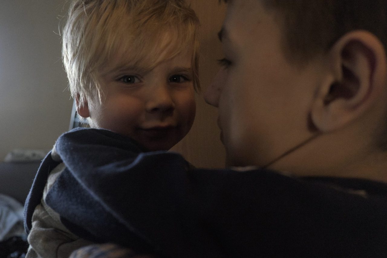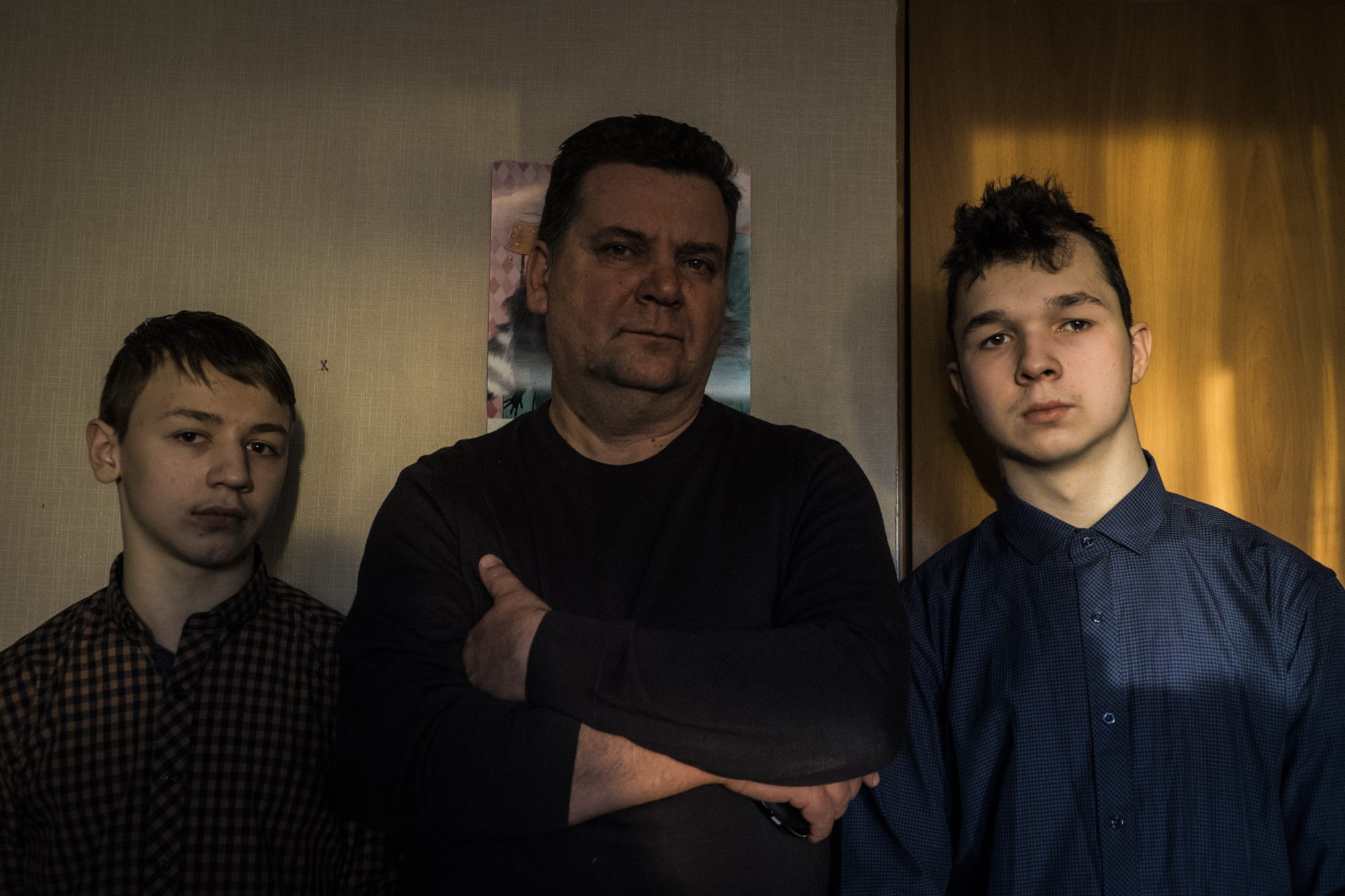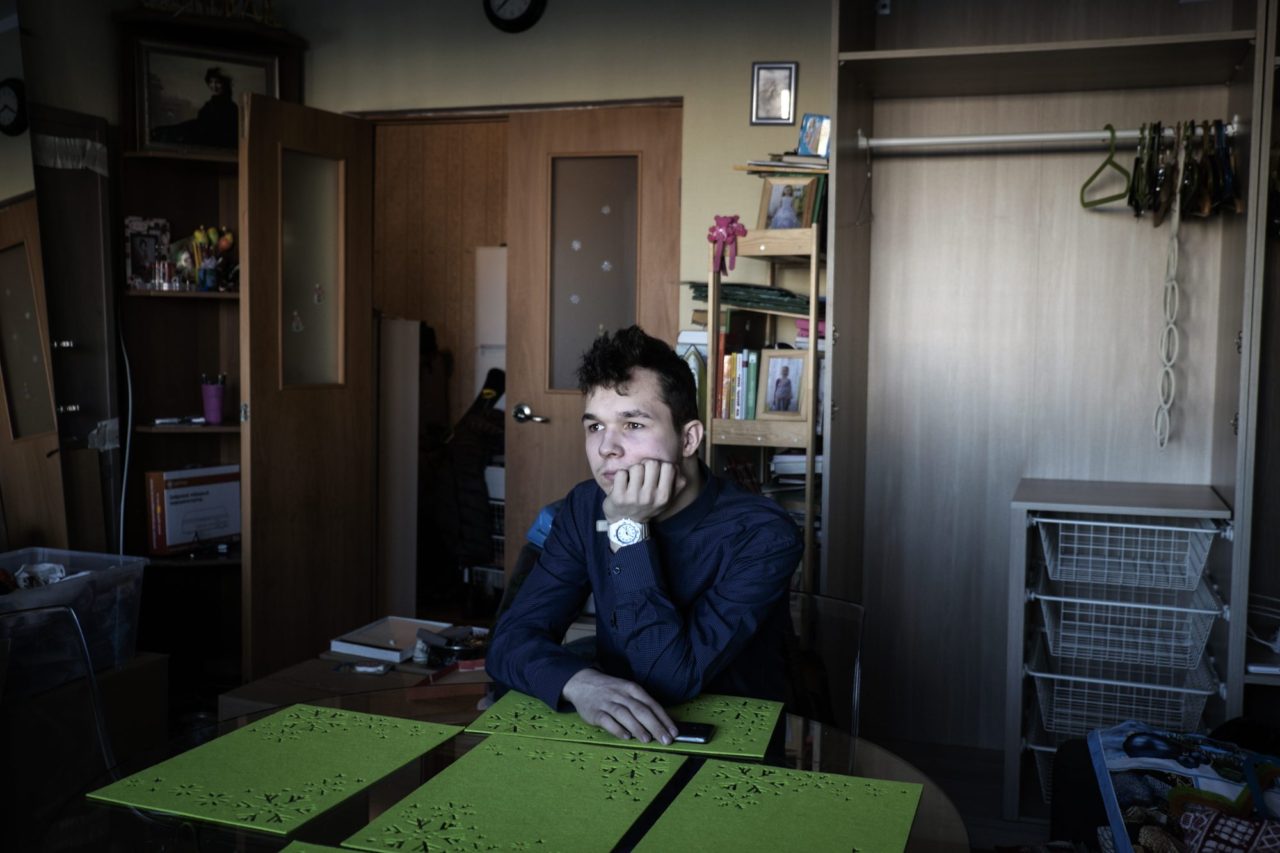 Квартира заставлена коробками и сумками, на днях семья переезжает. Михаил предлагает кофе, шестнадцатилетний Филипп играет в телефон, пятнадцатилетний Михаил сидит с трехлетним Никитой. Все заметно растеряны. Фотограф спрашивает, можно ли осмотреться, Михаил говорит: «Да-да, конечно!» Никто из семьи не делает попытку проконтролировать, куда мы заходим и что фотографируем.