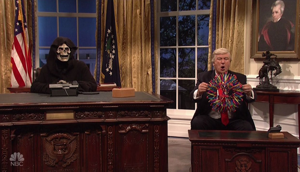 Актер Алек Болдуин во взъерошенном белом парике сидит за письменным столом в Овальном кабинете. За его спиной — Смерть, она символизирует Стивена Бэннона, советника президента США Дональда Трампа. На протяжении пяти минут Смерть раззадоривает Болдуина — Трампа, пока тот звонит по телефону мировым лидерам и грозит им войной. В финале Смерть сама садится за стол, Трамп пересаживается за детский столик рядом и погружается в игрушки: если кто-то не понял, именно Смерть-Бэннон — настоящий президент США.