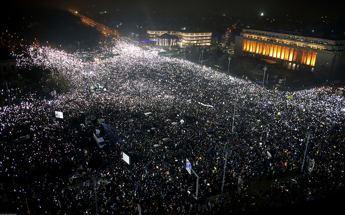 Люди выкрикивают лозунги, бьют в барабаны, свистят в свистки и размахивают надувными молотками. По ночам площадь озаряют огоньки смартфонов. «Это требование настоящей демократии, а не ее жалкого подобия, которое засело в парламенте и правительстве! Студенты, рабочие, народ! Румыны, не уходите домой!» — призывают народные трибуны. «Румыны, сопротивляйтесь! Мы можем победить!» — кричит молодая жительница Бухареста Андра. Она уверена: «На днях нас станет только больше. Это не чертовы девяностые, сегодня нельзя просто взять и изменить закон!»