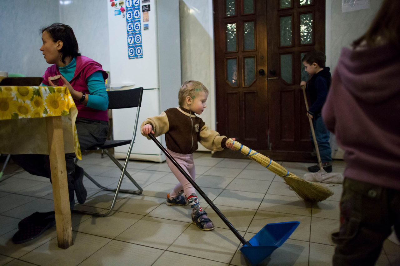 В доме нет вай-фая и федерального телевидения. Важные новости мамочки узнают по воскресеньям. От прихожан. Церковь евангельских христиан-баптистов находится прямо под боком Центра. В основном зале сейчас идет ремонт. Там, где временно проходят воскресные служения, по вечерам сушится белье, а по праздникам показывают мультики на проекторе. На кухне четыре холодильника, суп варится в большой эмалированной кастрюле-баке. Рядом с умывальником от руки написанный плакат: «Все делайте без ропота и сомнений».