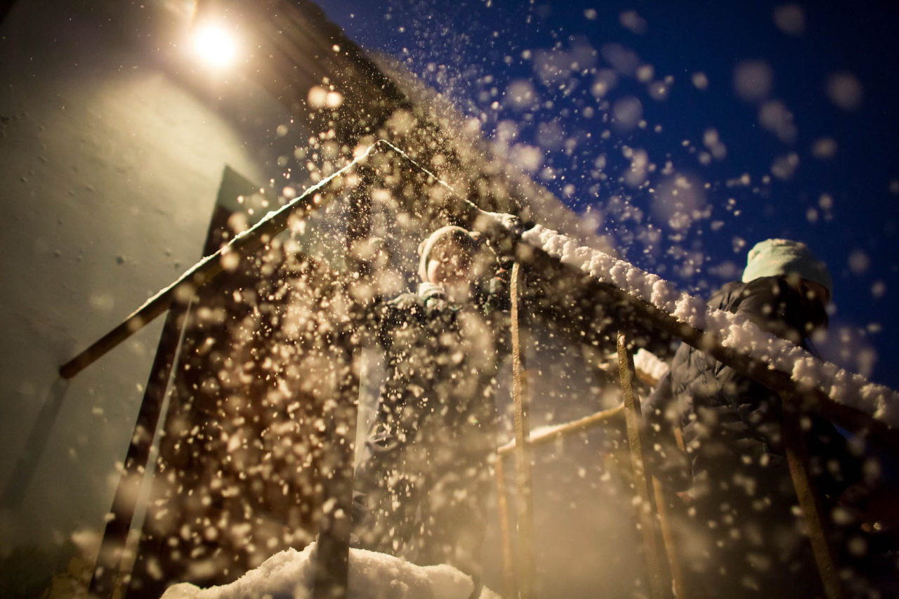 Илья забрался на лестницу и сбрасывает вниз снег с поручнейФото: Елена Игнатьева для ТД