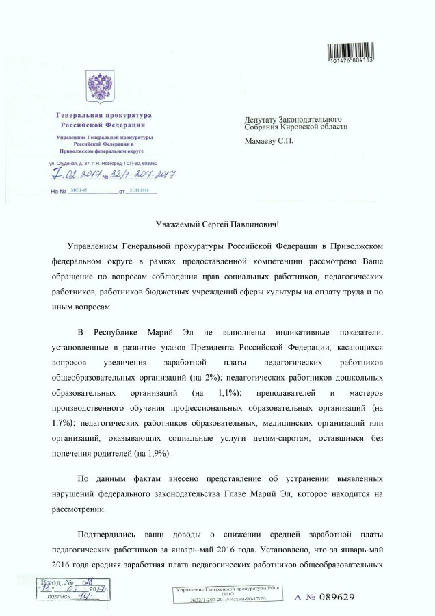 Сергей Мамаев, как руководитель Межрегиональной приемной Председателя ЦК КПРФ Геннадия Зюганова в ноябре 2016 года направил официальные запросы в Генеральную прокуратуру России в связи с неисполнением “майских” указов Президента России в Республике Марий Эл.