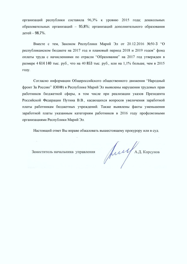 Заместитель начальника Управления Генеральной прокуратуры России в Приволжском федеральном округе также сообщил, что согласно информации Общероссийского общественного движения “Народный фронт За Россию” (ОНФ) в Республике Марий Эл выявлены нарушения трудовых прав работников бюджетной сферы, в том числе при реализации указов Президента Российской Федерации Путина В.В., касающихся вопросов увеличения заработной платы работникам бюджетных учреждений. Также выявлены факты уменьшения заработной платы указанным категориям работников в 2016 году профсоюзными организациями Республики Марий Эл.