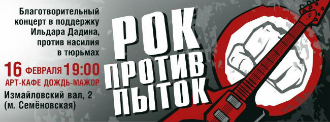 16 февраля в арт-кафе "Дождь-Мажор" (Измайловский вал, 2, рядом с метро Семеновская) состоится благотворительный концерт "Рок против пыток" в поддержку политзека Ильдара Дадина, против насилия в тюрьмах. Начало в 19:00, вход бесплатный.