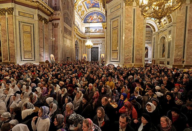 Утром в воскресенье неподалеку от центрального входа в Исаакиевский собор один за другим парковались автобусы. Из них выходили священники и просто верующие, они направлялись на богослужение. Говорили, что приехали по зову сердца и будут молиться за то, чтобы храм Божий оказался в руках служителей Господа. «Никаких музеев здесь быть не должно», — показывает на Исаакий один из паломников.