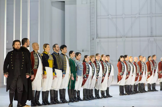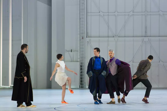 Что такой реакции стоит ждать, стало ясно уже после первых пятнадцати минут спектакля. Уныло одетые певцы и танцовщики на пустой сцене, почти не сходя с места, начинают рассказ про тест на верность, который устроила для своих возлюбленных пара солдатиков, подстрекаемых познавшим жизнь престарелым бонвиваном в сговоре с неуемной служанкой. Спектакль на всем протяжении остается верен этой эстетике минимализма в духе дефиле Jil Sander. Действие разворачивается в выбеленном пространстве открытой до стен сцены при полном отсутствии декораций — за исключением плексигласовых «кулис», которые ничего не скрывают, и как будто случайной стеклянной полочки с алкоголем на глубокой периферии зрительского внимания. Артисты одеты в безликий casual. Разве что плащ Дона Альфонсо отдает чем-то пиратским. Принципиальная монохромность сцены прерывается строго рассчитанными насыщенными цветовыми пятнами — лимонным, розовым, цветом фуксии.