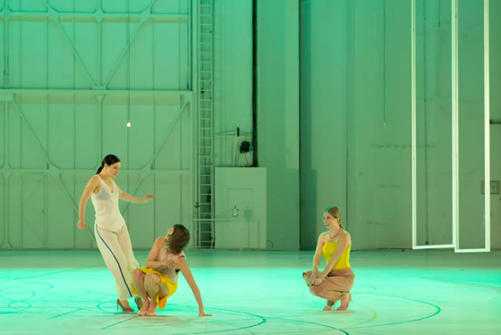 Персональные черты персонажей тоже как будто засвечиваются, теряют контур, остаются следом самих себя. Контакт на сцене принципиально отменен или формулируется в виде симметричных перемещений на большом расстоянии друг от друга. Дуэт возникает лишь однажды, у танцовщиков, — и производит эффект разорвавшейся бомбы. Но лишь для того, чтобы вновь разбросать исполнителей по периметру.