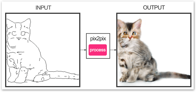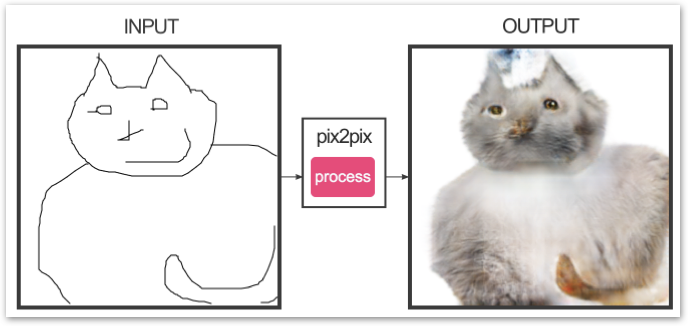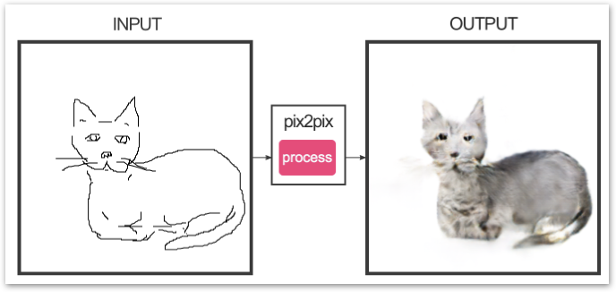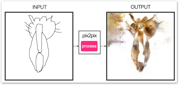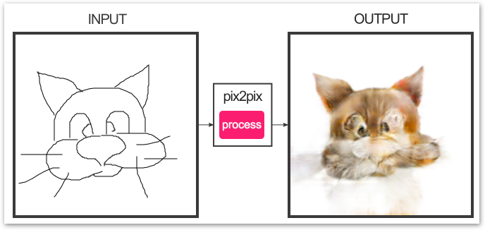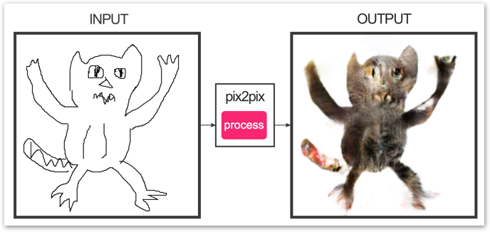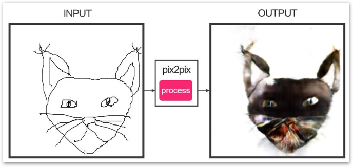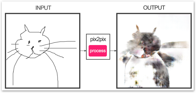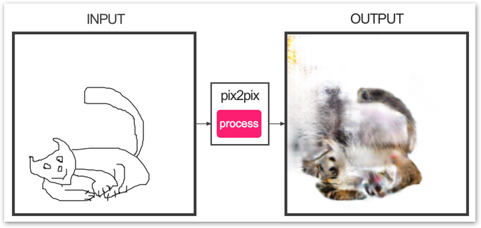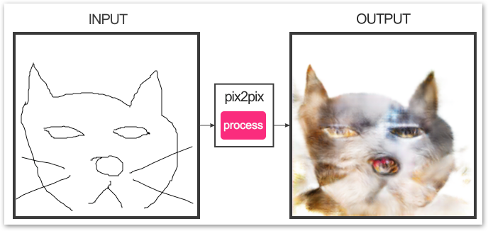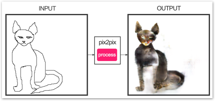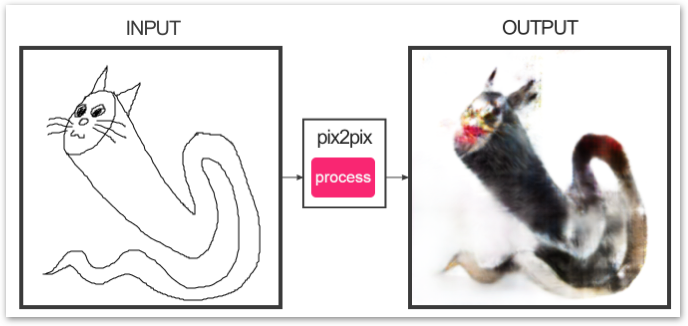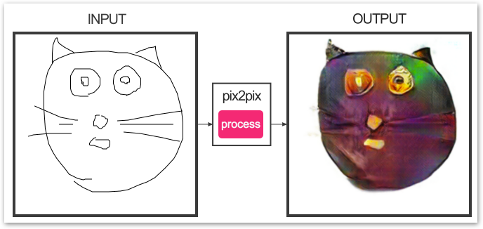 Пользователю предлагается нарисовать в левом окне кошку, нажать «process» и посмотреть, как нейросеть попытается «дорисовать» иллюстрацию. В качестве примера по умолчанию предлагается такая красивая пара: