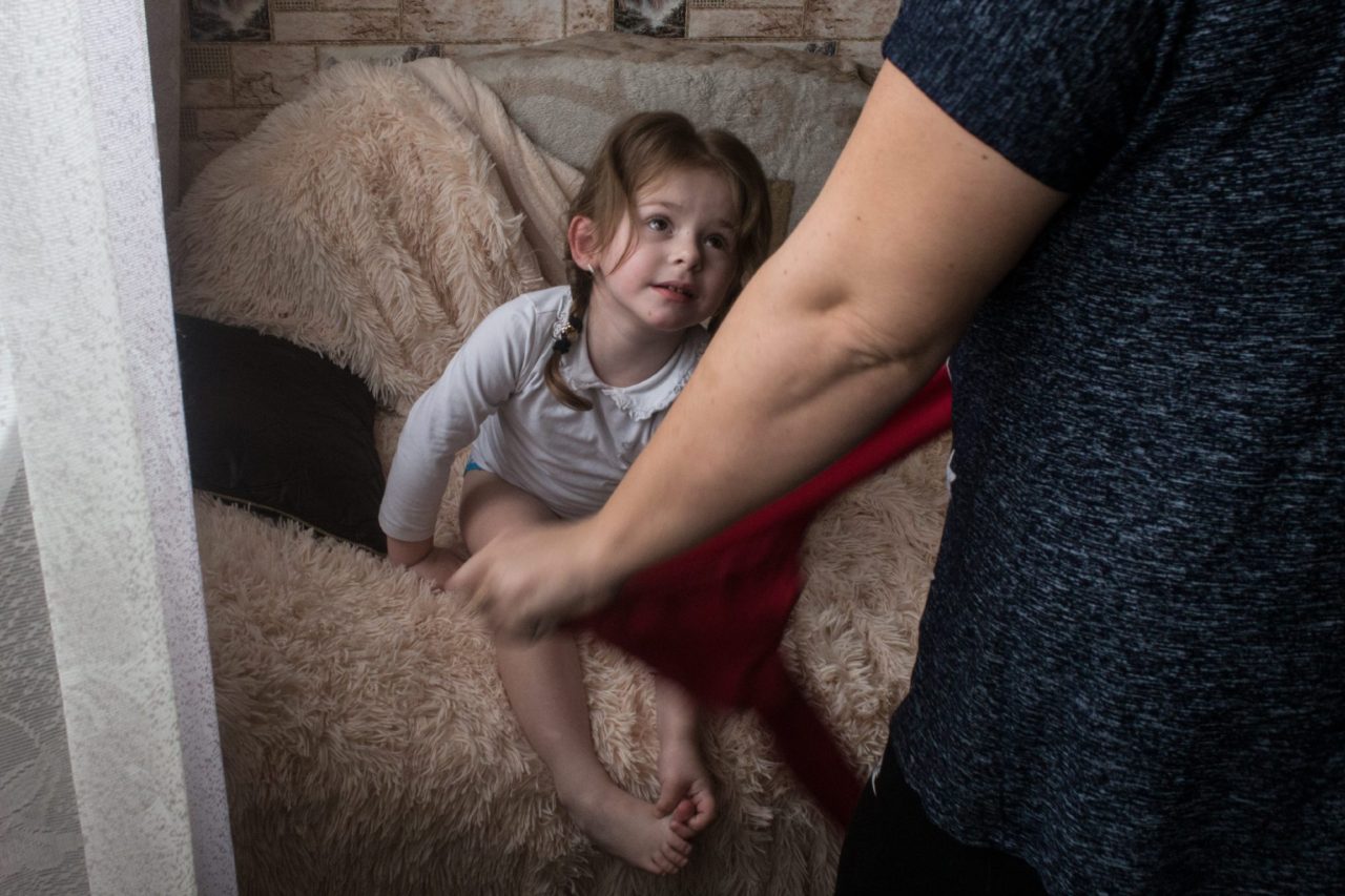 Алина видит только одним глазом, хромает на правую ногу. Она может поднимать и опускать правую руку, но кисть не двигается, как будто чужая. Поражена правая сторона. Почки, глаз, сердце, голова. Органы покрыты наростами, как лягушка. «Она у меня сильная девочка, — гордо произносит Оля. — Борется со своими проблемами. Если упадет, то не скажет: “Мама, дай руку”. Сама поднимется, хотя ей тяжело, я знаю. Иногда пытается вложить вилку в правую кисть и злится, что не получается. А потом забывается».