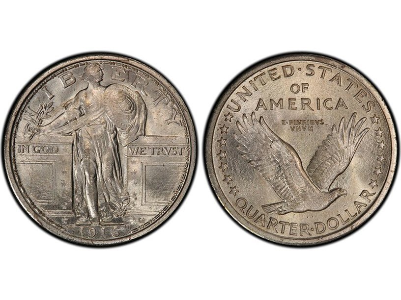Новая монета в 25 центов поступила в обращение 1 января 1917 года, но на самих монетах был указан 1916 год. Первый тираж составил 52 тысячи экземпляров. В отличие от предшественницы, на которой была изображена в профиль голова женщины, олицетворяющей Свободу, на этой монете аллегорическая Свобода стояла в полной рост. Поэтому у нумизматов монета известна как Standing Liberty quarter. На обратной стороне был изображен летящий орел, в окружении звезд и надписи «Соединенные штаты Америки. Четверть доллара».