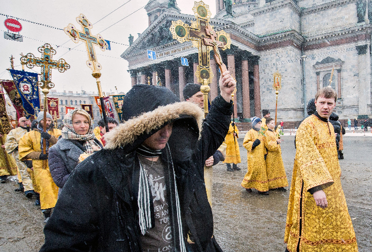 19 февраля вокруг Исаакия прошел очередной крестный ход. На этот раз массовость была налицо: тут и семинаристы, и группы детей с учителем (воспитателем?), все прихожане, не поленившиеся прийти. Можно, конечно, считать, что всем этим людям заплатили лично представители Московского патриархата, но многие из них шли искренне и не понимали нападок журналистов. Сторонникам передачи собора вновь «повезло» с погодой — по перекрытым дорогам вокруг Исаакия люди шли, сопротивляясь гудящему ветру, под мокрым снегом. Мероприятие немного задержали, потому что в этот же день в соборе служили праздничную литургию в честь Дня православной молодежи. Молодежь — семинаристы-первокурсники — сошла со ступеней собора раньше и встала на ветру в ожидании ректора Духовной академии, архиепископа Петергофского Амвросия. Добрых полчаса парни мерзли без шапок, не двигаясь, изредка сметая замерзшими руками капли талого снега с икон. Фотографы успели отснять каждому целое портфолио портретов и задумались, не предложить ли ребятам шапки. В рядах сочувствующих РПЦ ждали фанатов «Зенита», но несколько человек в спортивной одежде у входа в собор на группировку не тянули, да и участия в действе не принимали. Зато были байкеры и активисты с имперскими флагами. Наконец появился архиепископ, и люди тихо пошли за торжественно-медленной машиной МВД. А после, уже в соборе, организаторы предлагали подписать петицию против фильма «Матильда». Чтобы дважды не вставать.