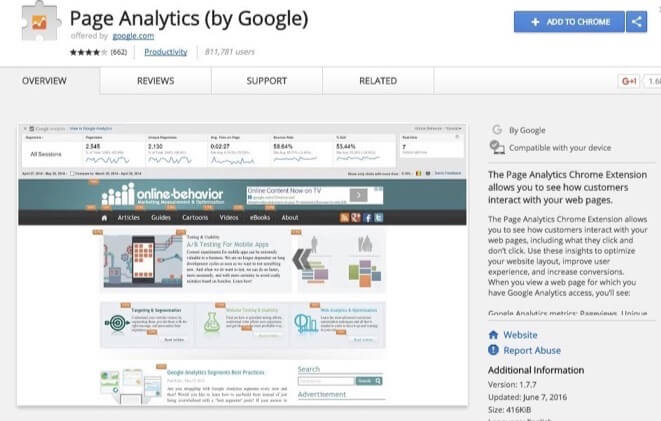 Представьте, что вы могли бы увидеть каждое действие пользователя на каждой конкретной странице вашего сайта? Вы можете. Своеобразная тепловая карта перемещений посетителя. Просто включите расширения для браузера на странице аналитики.