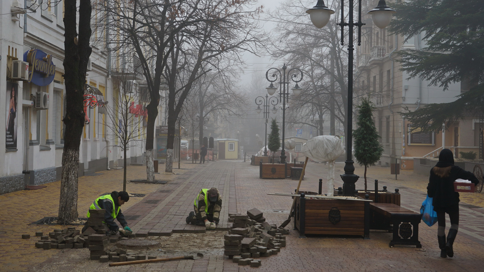 В Симферополе рабочие подрядной строительной компании ООО «Крым-Девелопмент» проводят работы по замене тротуарной плитки на месте ими же капитально отремонтированного накануне дорожного покрытия на улицах Карла Маркса и Пушкина.