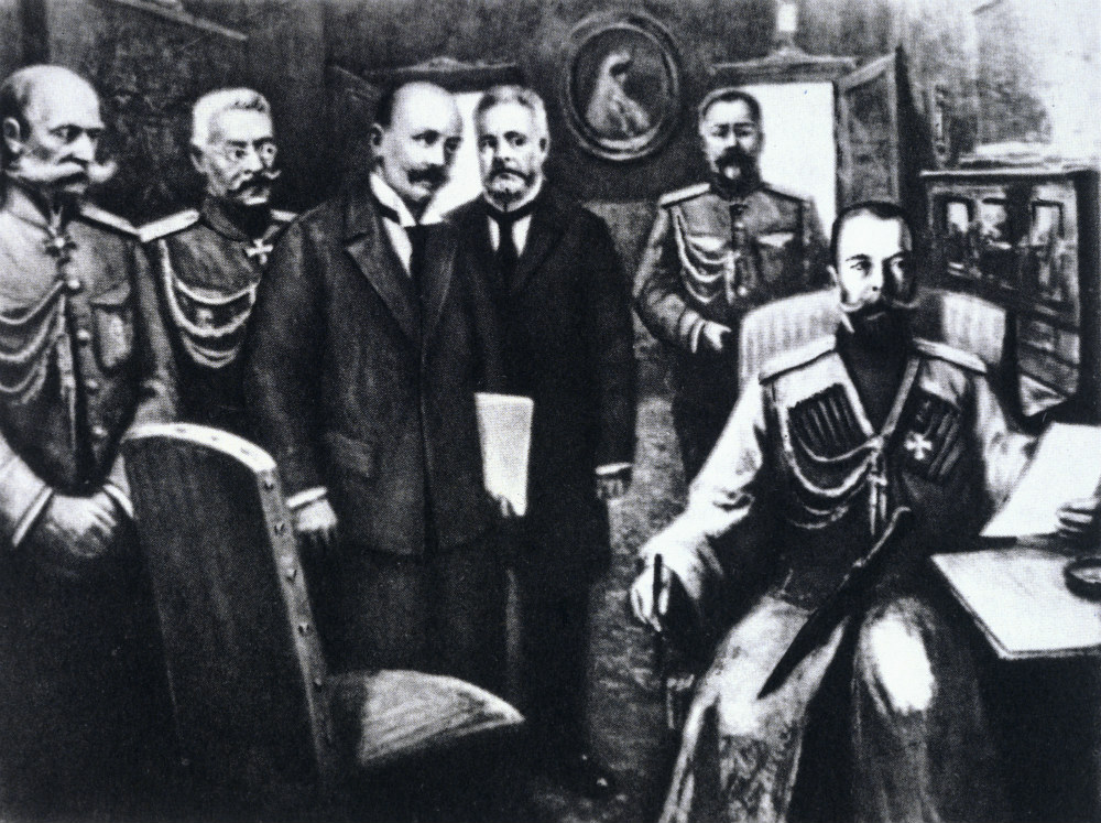 Отречение императора России Николая II. В царском вагоне (слева направо): министр двора Владимир Фредерикс, командующий Северным фронтом Николай Рузский, депутаты Госдумы Василий Шульгин и Александр Гучков, император Николай IIФото: РИА Новости
