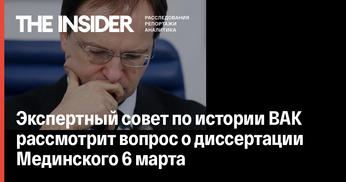 Экспертный совет по истории ВАК примет решение о том, какая комиссия будет рассматривать материалы диссертации министра культуры Владимира Мединского в понедельник, 6 марта. Об этом рассказал The Insider глава совета Павел Уваров.