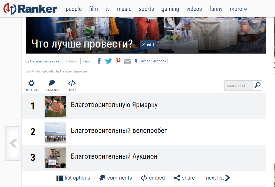 Онлайн-платформа для создания голосований. На сайте Ranker вы видите огромную базу уже созданных онлайн-голосований. Ежемесячно Ranker посещают 20 млн пользователей.