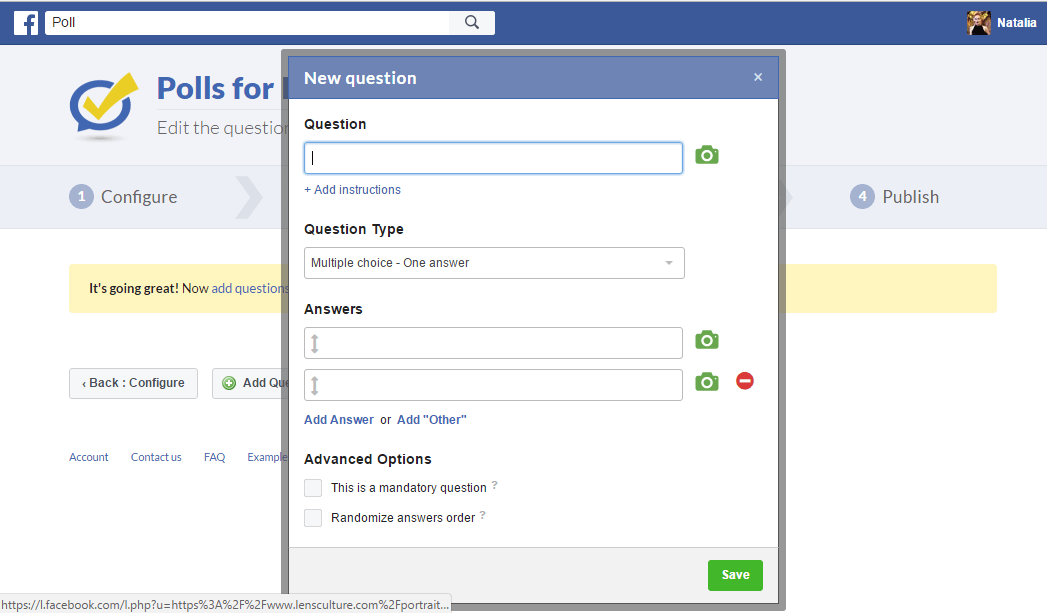 Бесплатное приложение для организации голосований в Facebook. Работает просто и понятно. Вы даете название опросу, небольшое описание, ответы, можно добавить фотографии к ним. А затем публикуете у себя на страничке. Неудобно то, что пользователю придется перейти по ссылке, чтобы проголосовать. После вы можете посмотреть статистику голосования и его участников.