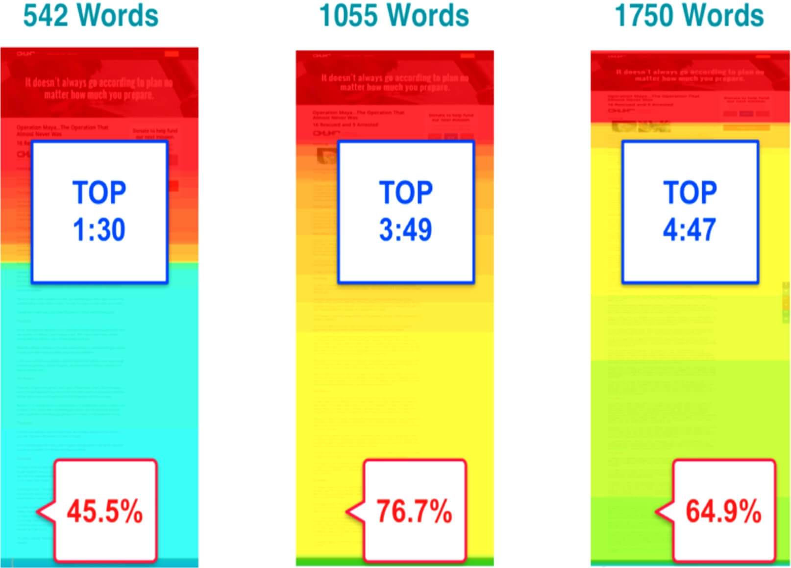 Чтобы ответить на эти вопросы, Крис попросил команду OURescue написать несколько статей в трех вариантах: коротком, среднем и длинном. После этого с помощью сервиса Optimizely мы направили трафик на каждый из вариантов. Затем с помощью Hotjar мы отследили три фактора: