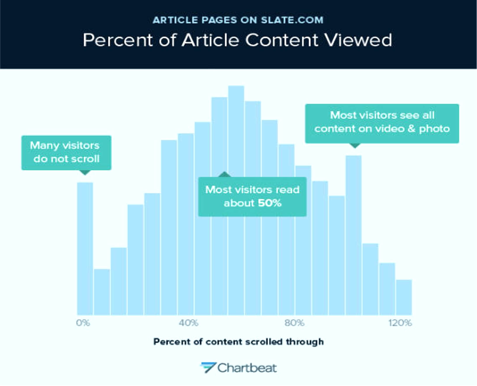 Chartbeat провел исследование с целью определить, насколько далеко продвигаются пользователи в чтении типичного поста в блоге. Оказалось, что средний пользователь читает лишь около половины текста.