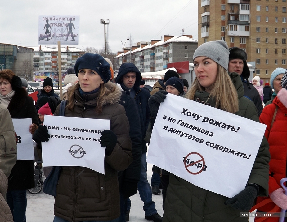 'Party "United Russia", which talked about support of families with many children six months ago, made its choice. Sergey Gaplikov [head of the Komi] who came here and conducted public hearings, introduced the bill and by his own decision cancelled two points of his own program. We must show our opinion — activist called and offered everyone to speak.