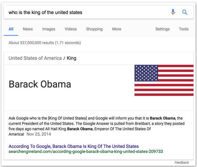 Но в последнее время выдаче гугла начали появляться не столь курьезные неправильные ответы. Поисковик убеждал пользователей, что бывший президент США Барак Обама собирается ввести военное положение и готовит государственный переворот. А также называл политика «королем Соединенных Штатов», сначала ссылаясь на соответствующую статью, а затем — на заметку о том, что гугл называет Обаму «королем США».
