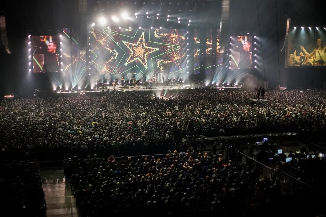 Конечно, стадионный концерт — это не про слова, а про энергию. Про звук, который сносит с ног, светящиеся экраны телефонов над головой, зажигательные танцы Юрия Юлиановича на краю сцены и пение хором «Последней осени».