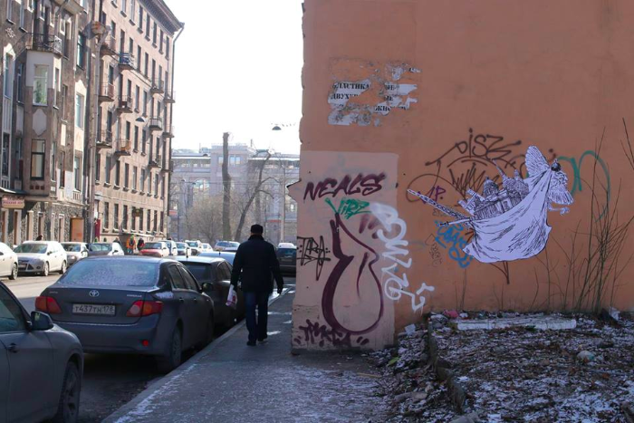 На Сытнинской улице появилось граффити с птицей в шапке священника, укравшей памятники Петербурга