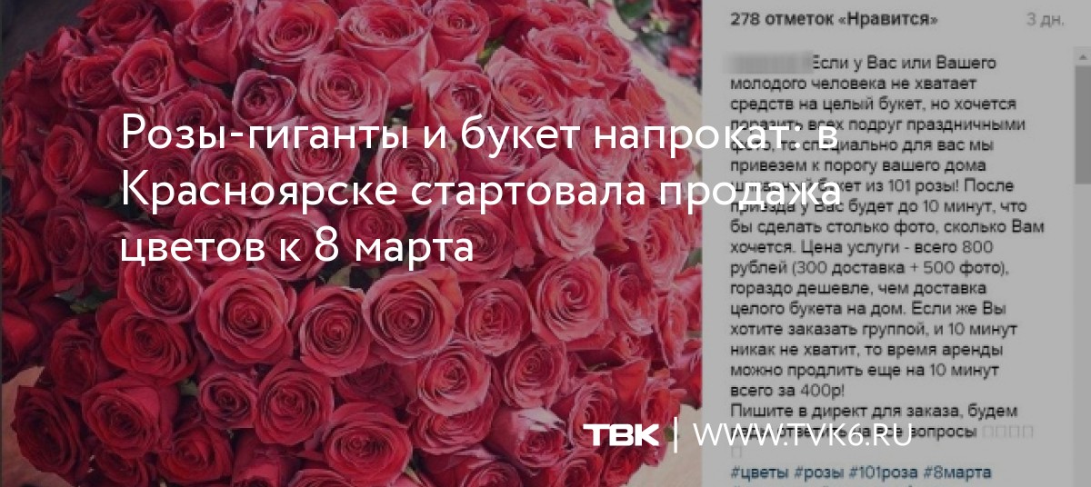 Розы-гиганты и букет напрокат: в Красноярске стартовала продажа цветов к 8 марта