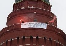 Внутри Кремля другая группа развернула плакаты с лозунгами "Женщину - в президенты", "Нас большинство", "Женщину - в патриархи", "Вся власть - женщинам". Наконец, еще несколько протестующих поднялись на Угловую Арсенальную башню. Как пояснялось в пресс-релизе акции, участницы сумели пройти досмотр, поскольку надписи были выполнены на юбках и платках.
