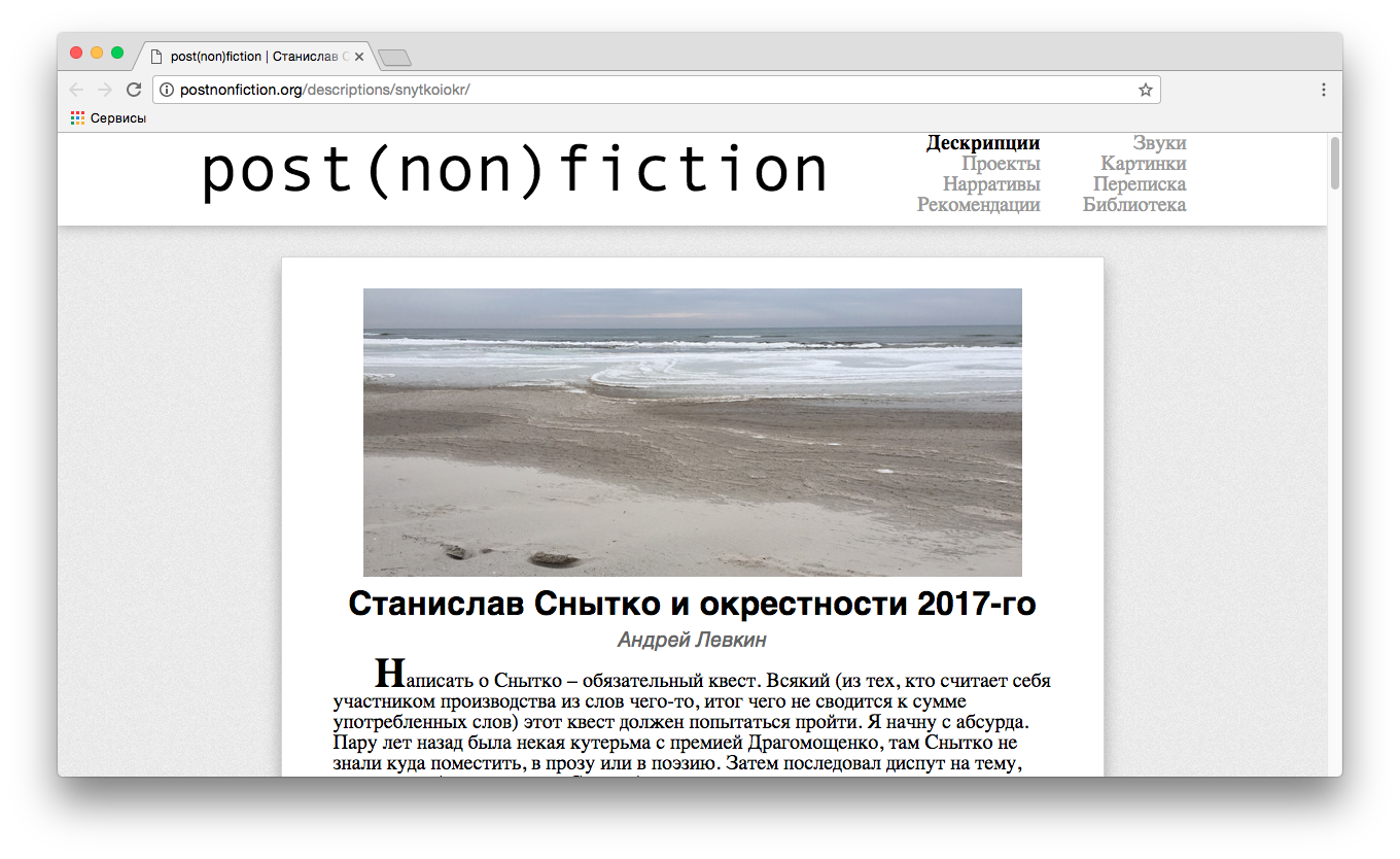7. На Post (non) fiction Андрей Левкин пишет о Станиславе Снытко, высказаться о котором, по его мнению, — «обязательный квест» для тех, кто сейчас занят осмыслением словесности. Текст Левкина стилистически напоминает заметки «для себя», дружеское письмо или расшифровку устной речи, что вполне соответствует адекватному, по мнению Левкина, восприятию текстов Снытко. Проза Снытко рождается и живет в динамике, само письмо здесь важнее, чем его цель, и чтению этой прозы соответствует такая, например, космогония Левкина: «Человек станет дробиться на персонажей, с которыми будет что-нибудь происходить (маленькие такие, как бы выезжают из лба — с божьими коровками легко представить: одна большая, а из нее во все стороны — фррр — маленькие, а большая отчасти остается, но обесцвечивается, делается полупрозрачной). Большая, это как центр сбора ощущений, но она прямо с реальностью не связана, реальность ей будут поставлять приключения мелких. Так что и хотеться будет чего-то небольшого и ситуационного, причем — каждой маленькой б.к. — свое. Никакого согласования, просто их сиюсекундные ощущения, они станут быть основными». Левкин вспоминает и казус с первой премией Драгомощенко, когда жюри так и не договорились, к поэзии или прозе отнести тексты Снытко: «Вышеупомянутый абсурд не только в том, что данная проблема (проза или поэзия) еще кого-то волнует, а и в поводе: как-никак, там была премия Драгомощенко, который… Ну, бессмысленно воспринимать АТД по жанрам, все это одно». То же со Снытко: «Ну и тут снова: проза, поэзия? А какая разница? Да, она есть для социального бытования текстов, но кого же это волнует, кроме организаторов литературного процесса и менеджеров книжных лавок? В отношении Снытко также неуместны рассуждения о том, какой бывает (может быть) проза (дескрипции, нарративы и тп). Во-первых, это дело системное, а не надо обобщать. Во-вторых, такие рассуждения фиксируют некое положение вещей, которое сложилось давно, а тут-то выход за его пределы. У Снытко тексты нетипичны».