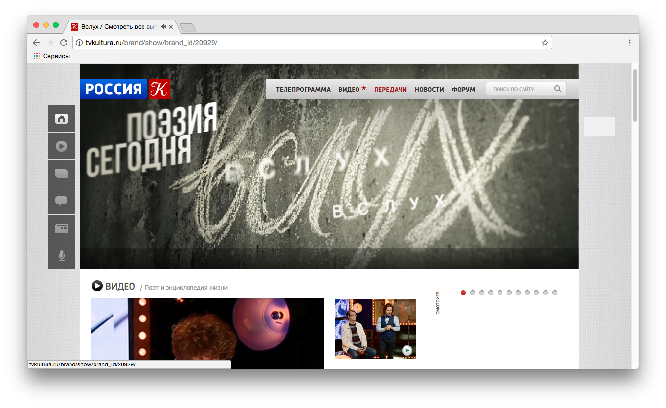3. Закрыта программа о современной поэзии «Вслух», выходившая на канале «Культура». На сайте канала остался архив программы — более 50 выпусков и более 200 авторов. В последней передаче снялись Евгений Бунимович, Лев Рубинштейн, Данил Файзов и Татьяна Барботина.