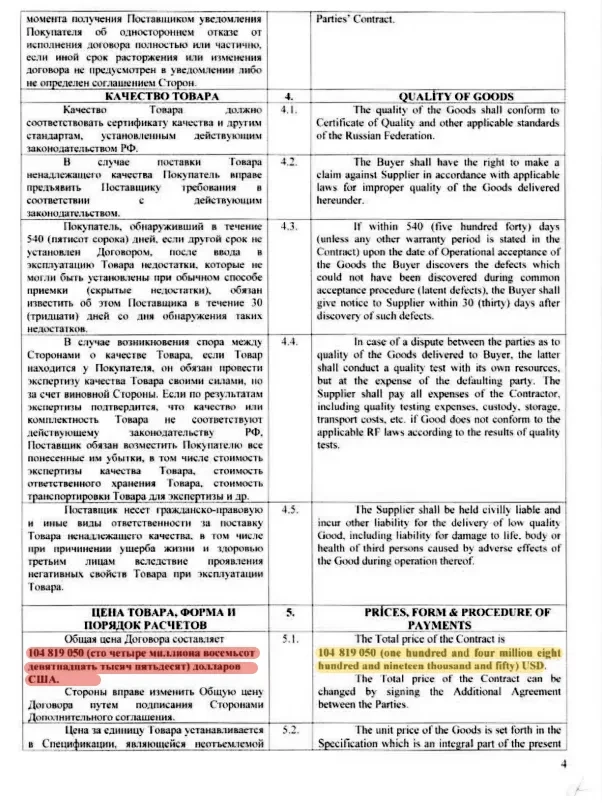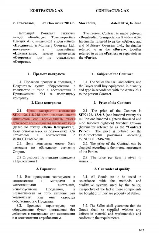 Согласно второму контракту, Multiserv Overseas продает то же самое оборудование в том же количестве российской компании «Бомбардье транспортейшн (Сигнал)» уже за 104 млн долларов. Два контракта идентичны во всем, кроме цены.