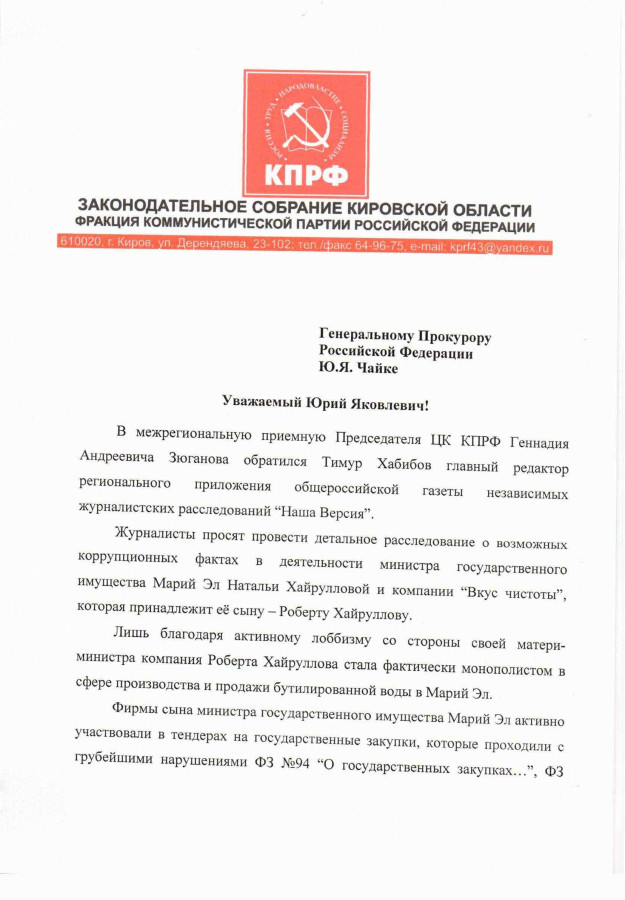 В январе 2017 года журналисты Общественного комитета по борьбе с коррупцией в Марий Эл обратились к руководителю Межрегиональной приемной Председателя ЦК КПРФ Сергея Мамаева с просьбой, направить запросы в Генеральную прокуратуру и МВД России о корупционной деятельности министра госимущества Натальи Хайрулловой и её сыновей.
