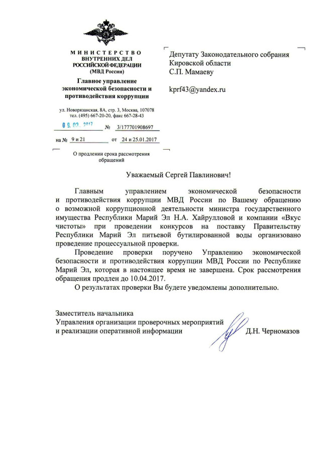 9 марта 2017 года Заместитль начальника Управления организации проверочных мероприятий и реализации оперативной информации ГУЭБиПК МВД России Д.Н. Черномазов сообщил депутату Сергею Мамаеву, что организована дополнительная проверка о возможной коррупционной деятельности министра госимущества Натальи Хайрулловой .