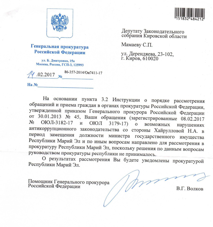 Помощник Генеральной прокуратуры В.Г. Волков в официальном ответе депутату Сергею Мамаеву сообщил, что в настоящее время идет проверка со стороны Прокуратуры Марий Эл в отношении возможных фактов нарушения антикоррупционного законодательства со стороны министра госимущества Натальи Хайрулловой.