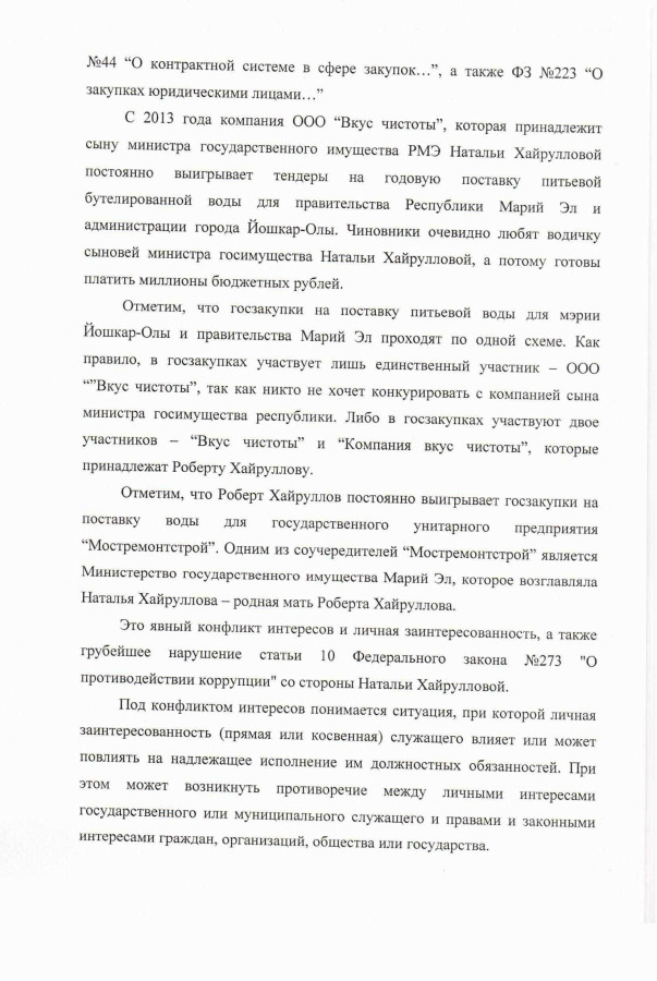 C 2013 года компания ООО “Вкус чистоты”, которая принадлежит сыну министра государственного имущества Натальи Хайрулловой постоянно выигрывает тендеры на годовую поставку питьевой бутилированной воды для Правительства Республики Марий Эл и администрации города Йошкар-Олы. Чиновники очевидно любят водичку сыновей министра госимущества Натальи Хайрулловой, а потому готовы платить миллионы бюджетных рублей.