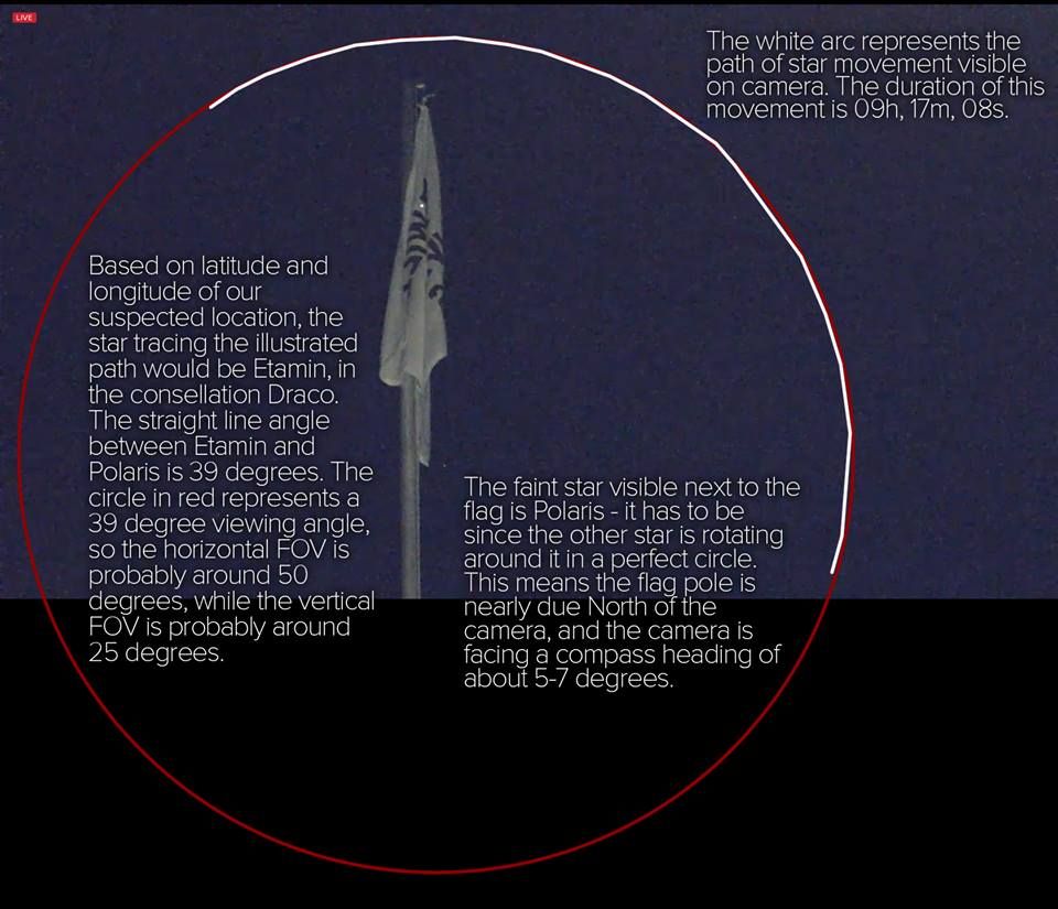 Затем в эту местность отправили водителя, который ездил и нажимал на гудок. По звукам, которые слышны на трансляции, получилось сузить район поиска, но он все равно был слишком большим. Тогда на 4chan стали наблюдать за звездами, которые были видны за флагом.