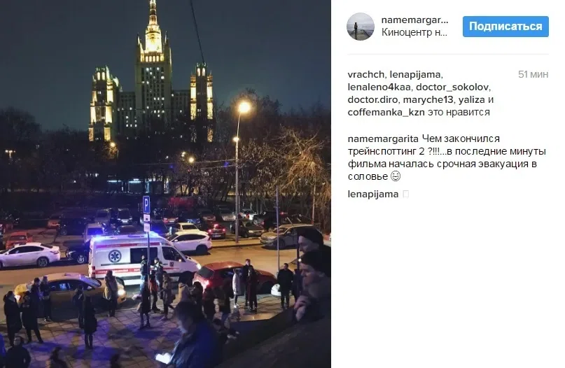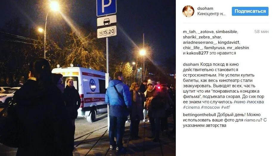 «Когда поход в кино действительно становится остросюжетным. Не успели купить билеты, как весь кинотеатр стали эвакуировать. Выводят всех, часть шутит что им “понравилась концовка фильма”, подъехала скорая. До сих пор не знаем что случилось», — написала пользователь Instagram с ником dsoham.