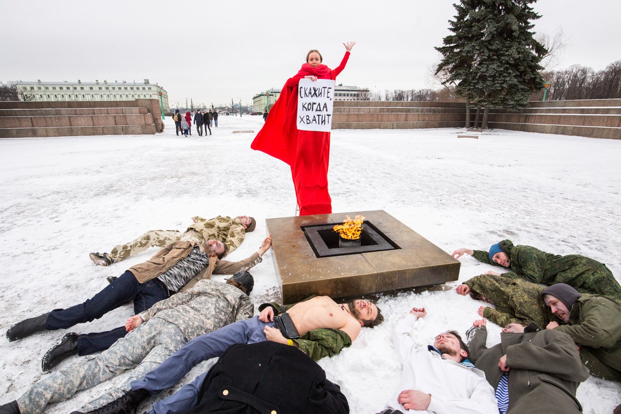 23 февраля в Петербурге на Марсовом поле прошла театрализованная акция противников военной службы. Женщина в красном, напоминающая образ "Родины-матери", встала с плакатом "Скажите, когда хватит", а на земле вокруг Вечного огня легли мужчины, изображающие убитых на войне. "Мы считаем саму идею "защитников" одним из столпов, на которых держится угнетение. Национальное, гендерное, любое. Мужчина с младенчества воспитывается с идеей о том, что он должен защищать. Но на самом деле его учат лишь агрессивному поведению и полному подавлению своих эмоций. И он вырастает человеком, склонным осуществлять насилие и контроль", – поясняют организаторы акции.