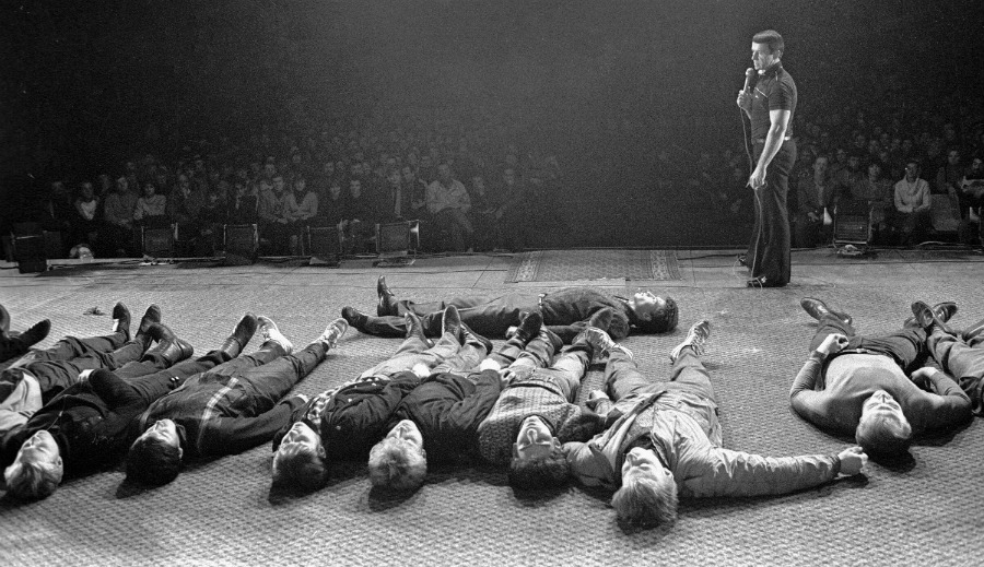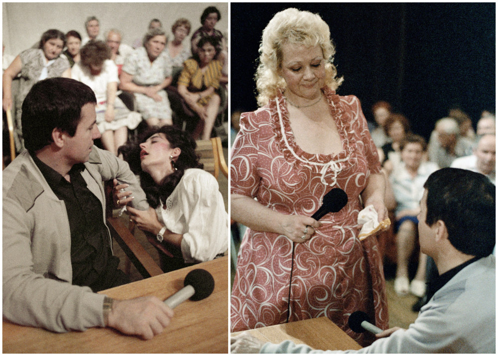 Когда на сцене лежат двадцать пять бездвижных тел, Кашпировский спускается в зал. Прохаживается между рядами и выбирает, кого бы излечить. Мамы подталкивают детей вперед. Женщины вытягивают шеи и замирают в надежде, что целитель заставит упасть именно их. Люди вскакивают со своих мест и ошарашенно смотрят на неподвижные тела вокруг: «Лежат», — констатируют зрители в разных частях зала.