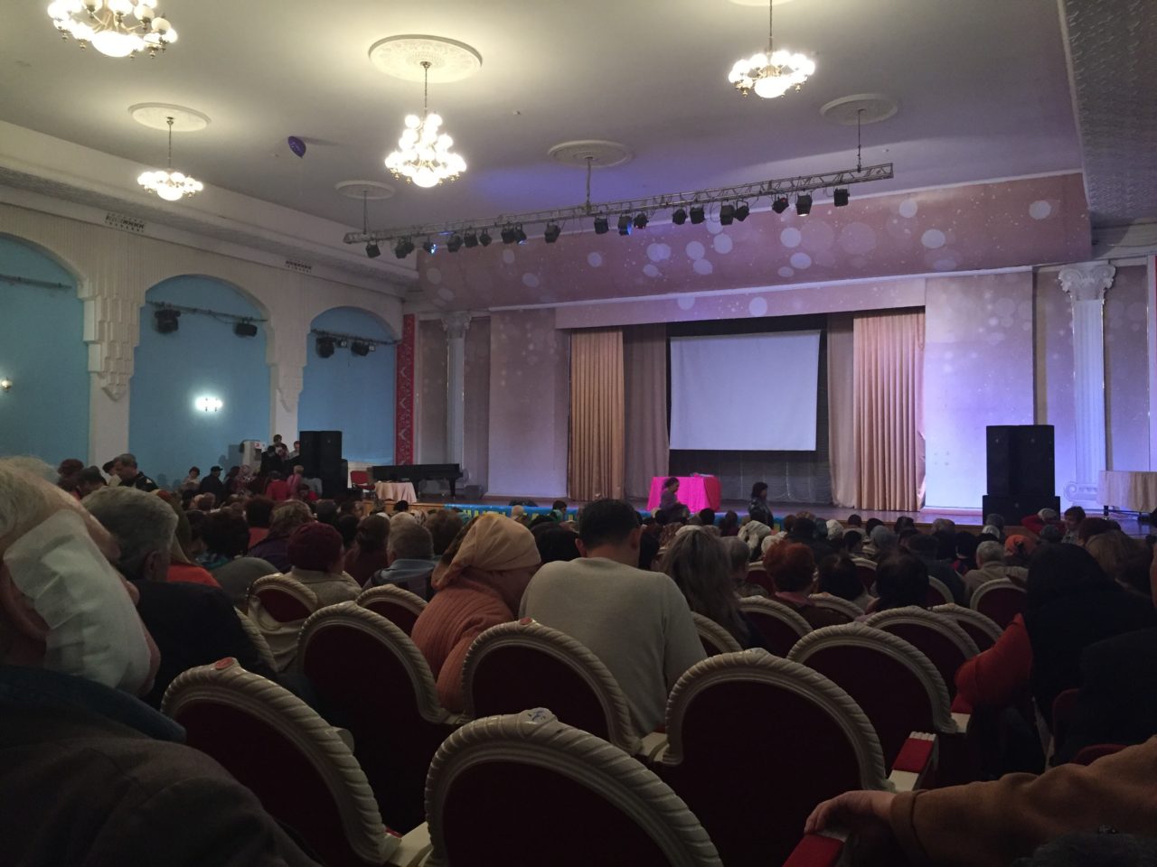 Лидия Михайловна пришла на выступление практически прямо из больницы. Из-за остеоартроза ей прооперировали ногу, из-за катаракты сделали операцию на глазах. Ей 81, на носу –аккуратные очки, в руках палочка. Она не знает, поможет ли Кашпировский, но надеяться все равно больше не на кого.