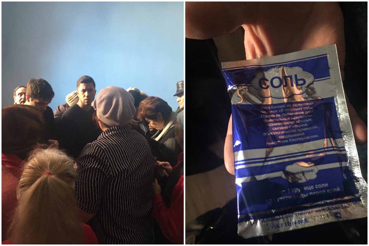 Наибольшей популярностью пользуются фотографии, соль в пакетиках и платные билеты на вечерние сеансы. Диски с записями выступлений 1989 года продаются по пять тысяч тенге, это примерно тысяча рублей. Фотографии — по тысяче тенге, как и целебная соль. Книга Кашпировского «Пробуждение» идет за 500, а билеты на вечерние сеансы, которые вот-вот начнутся, стоят пять тысяч.