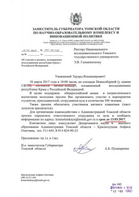Руководство Томского государственного университета 13 марта получило от администрации области письмо, в котором содержится просьба собрать 18 марта на митинг, посвященный годовщине аннексии Крыма, не менее 500 студентов и сотрудников вуза. Документ на имя ректора Эдуарда Галажинского поступил в вуз за подписью и.о. вице-губернатора региона Алексея Пушкаренко. Об этом сообщает агентство новостей ТВ2.