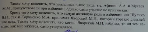 «Я употребил не более 50 граммов водки. В это же время Корниенко предложил всем присутствующим заняться сексом с моей девушкой Безноговой. [Мне это не понравилось] и я предложил ему выйти в коридор. [Там] между нами произошла драка, в ходе которой я нанес Корниенко один удар в подбородок, от чего тот упал. [Вскоре пришел Афонин], который стал предъявлять мне претензии и попытался меня ударить, но я повалил его на землю и объяснил причину [конфликта с Корниенко], после чего Афонин стал избивать последнего», — говорится в показаниях подростка. По словам Яворского, он попросил стоявшего рядом крупного мужчину по имени Астимир успокоить дерущихся, но тот грубо отказал и трижды ударил его в плечо. В это время Афонин оттащил Корниенко в коридор, а Емельянов принес из комнаты сумку с его вещами.