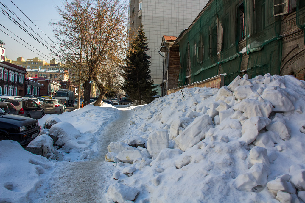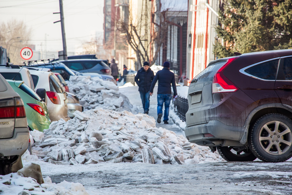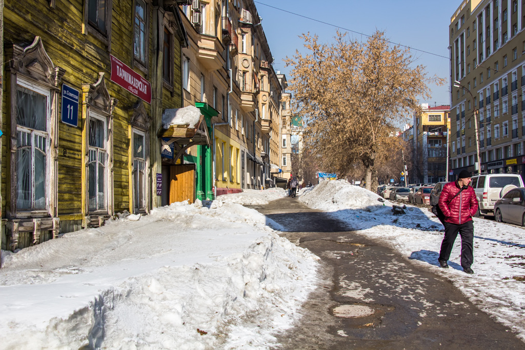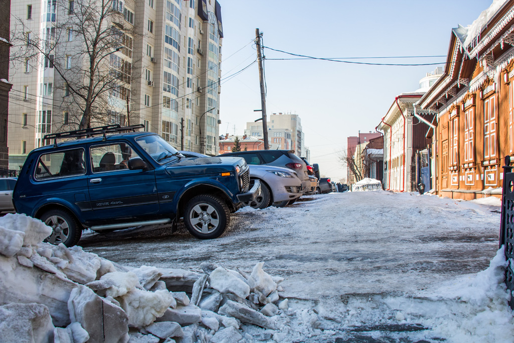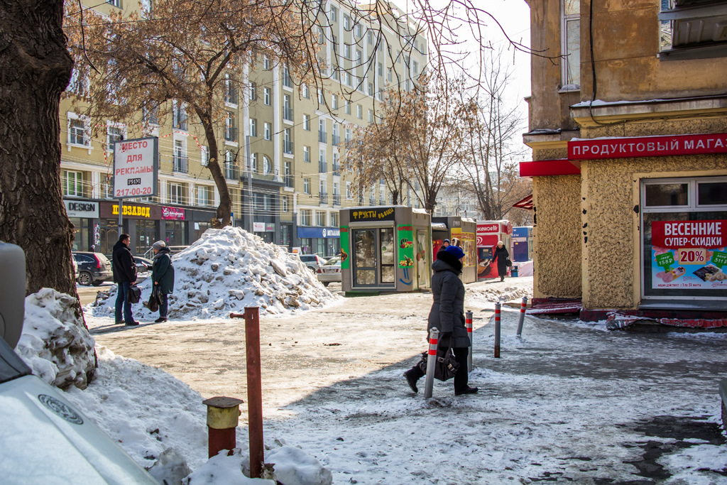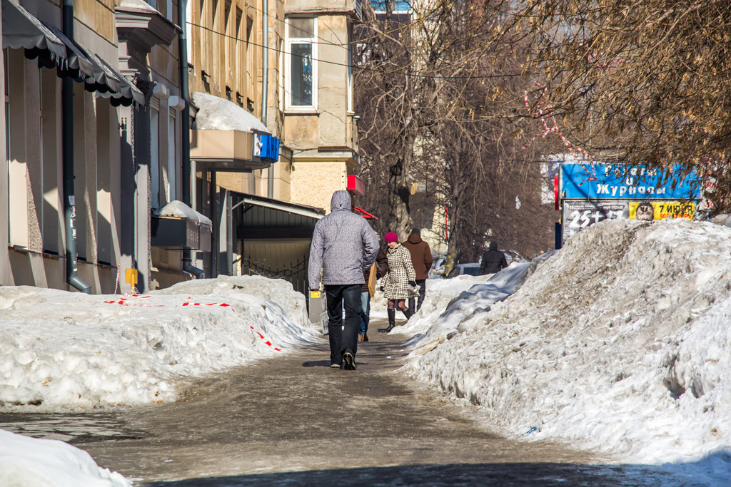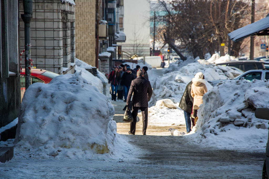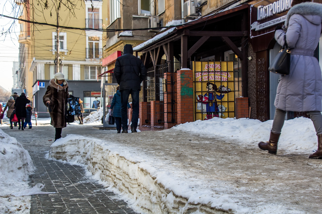 Съемка проходила в «тихом центре» — недалеко от редакции и на перекрестках идейно близких городской власти улиц — Коммунистической, Советской, Октябрьской, Урицкого и других, которые, казалось бы, должны чистить в первую очередь. К сожалению, ни одна мама с коляской не встретилась. А у них уже собственный ад для управляющих компаний и профильных служб мэрии.
