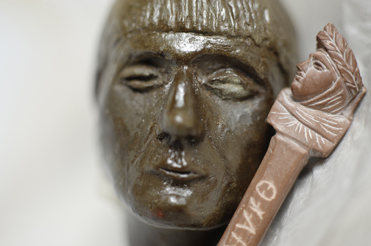 Из собрания Павла Лукницкого происходит и пластилиновая голова, вылепленная ему в подарок. Об этом есть дневниковая запись одариваемого, он скрупулезно вел дневник, где в лирически подробном ключе отразил и частности своей связи с А.А.А. Но еще один предмет, запечатленный на фото помимо скульптурного автопортрета, — карандаш с навершием в виде головы Данте, развернутой в профиль. Эта вещь принадлежала Николаю Гумилеву (чуть ли не единственная уцелевшая, которой он касался) и трактует скорбный образ А.А.А. иначе. Карандаш в масштабе изображения предстает пучком-фасцией, к нему примкнула незрячая голова поэта. Только вместо топора развернуто плоскостью острия лицо Данте. И Ахматова становится ликтором, защитницей абсолютистского государства языка и литературы. Ликтор наделен правом осуществлять казни.