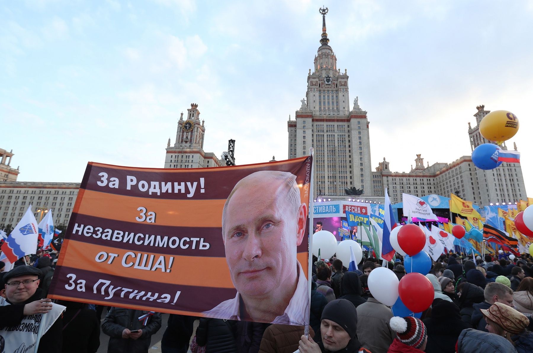 Фото: Вячеслав Прокофьев / ТАСС / Scanpix / LETA В Москве на Воробьевых горах 18 марта 2017 года в рамках фестиваля «Весна» прошел митинг-концерт, посвященный третьей годовщине присоединения Крыма к России. По данным МВД, его посетили 150 тысяч человек. Накануне студенты МГУ вышли к станции метро «Университет» с пикетами (и лозунгами «Университет наш», «МГУ не ВВЦ») и попросили не проводить политические мероприятия на площадке вуза.
