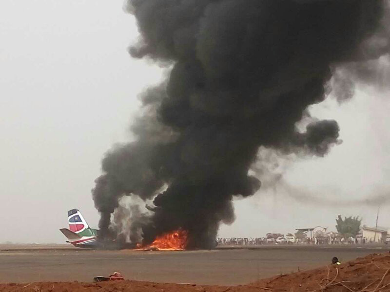 Южносуданская газета The National Courier в Twitter опубликовала фотографии с места происшествия. На них видно, что самолет сильно обгорел и пожарные машины тушат его останки.
